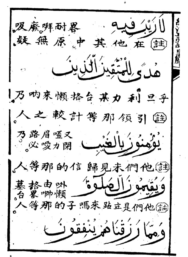 "The Chinese phonetic rendering, in this part of the book, is indicated after the Arabic text, and the. Chinese explanation follows. It is noteworthy that the Arabic text itself is not translated, the Faithful doubtless being supposed to understand it. The notes in Chinese which accompany each Arabic phrase, form an annotated explanation of the prayer or of the text written in colloquial language. All the rest, after the Fatiha, is composed entirely of verses of the Koran, likewise translated into the language of the common people."