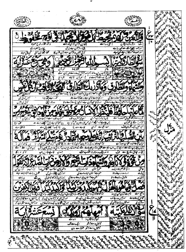 One of the earliest versions of the Koran for the use of Moslems was the translation made into Urdu by the learned Sheikh, Abd-ul-Kadir Ibn-i-Shah Wali UIlah, of Delhi, in 1790. This has appeared in several editions, lithographed, with the Urdu text interlinear with the original.8 An Arabic-Persian interlinear in two volumes was printed at Calcutta in 1831; Brunet also mentions a lithographed Persian interlinear translation (Ispahan, n.d.). The latest edition is a polyglot Koran in folio, lithographed in two colours at Delhi by the Farooki Press, 1315 A.H., and entitled Koran Majid, Terjumat Thalatha. The introduction is in Urdu, and the interlinear text gives first the Arabic, followed by a Persian translation, an Urdu free translation, and an Urdu literal translation. The Persian translation, is by Shah Rafi'-ud-Din. A facsimile, reduced, of one of the pages of this beautiful volume, is given herewith. In addition to the text a running commentary is given on. the margin, both, in Urdu and in Persian. In Persian we have other editions of the Koran with explanatory notes on the text, or attempts at literal versions. A scholarly translation of the Koran into Urdu was also made by the late Rev. Dr. Imad-ud-Din, of Amritsar, India. This was the first translation to be published in Roman-Urdu characters, and through the Christian Mission Press at Allahabad it has been widely circulated throughout India.