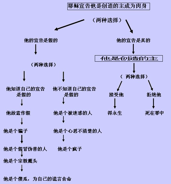 如果耶稣宣称他是上帝的儿子,与上帝原为一,这件事若属事实,那么,他就是创造的上帝成为肉身。我们必须相信接受他,或者拒绝他。