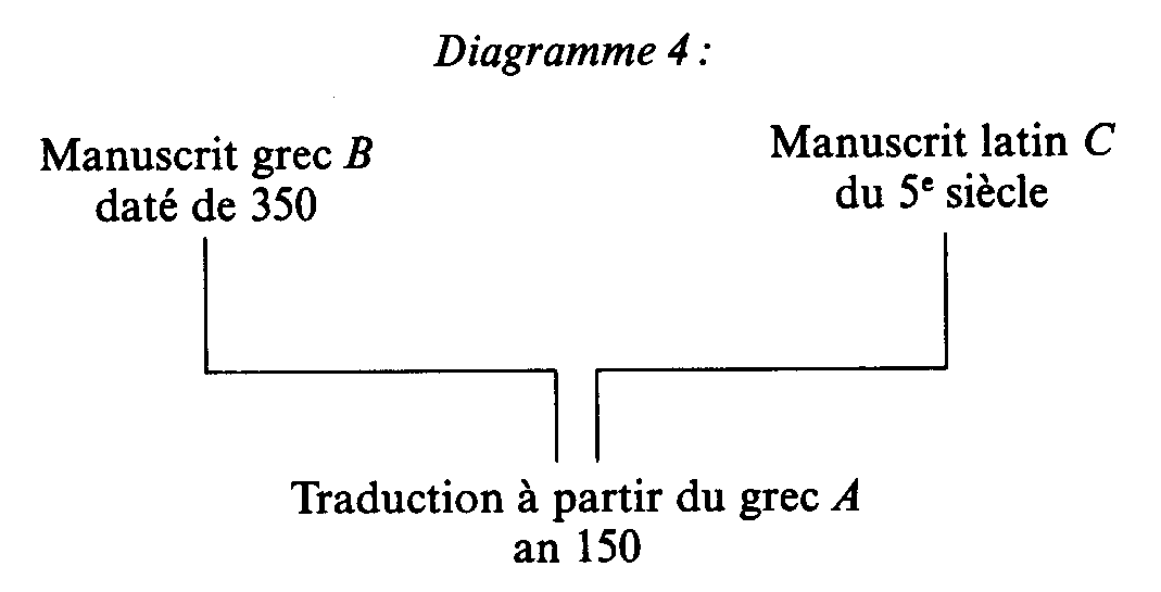 Le diagramme 4 présente un cas de filiation entre trois manuscrits. S'il y a concordance entre le texte de la traduction latine C daté du 5e siècle et celui d'une copie grecque remontant à l'an 200 ou 350 (sans que le latin soit la traduction directe de ce manuscrit grec B), c'est bien la preuve que nous possédons le texte exact du manuscrit grec d'origine A de l'an 150, date de la traduction. Citations de l'Evangile-Nouveau Testament faites par des auteurs chrétiens primitifs Pour ne citer qu'un exemple, je mentionnerai le témoignage de Tertullien, auteur chrétien ayant vécu entre 160 et 220. Il était ancien dans l'Eglise de Carthage, en Afrique du Nord. II fait, dans ses écrits, plus de 7000 citations des écrits du Nouveau Testament, dont 3800 pour les seuls récits de l'Evangile. La comparaison entre le texte de ses citations et celui correspondant de nos versions actuelles prouve à l'évidence qu'il n'y a aucun changement notable. Copies complètes de I'Evangile-Nouveau Testament du milieu du 4e siècle Enfin, bien qu'il ne s'agisse pas à proprement parler du