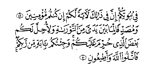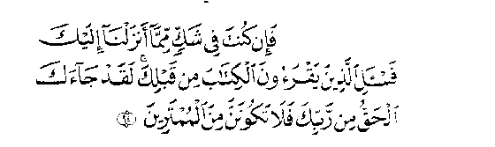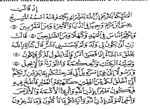 Les anges dirent: "O Marie! Allah t'annonce la bonne nouvelle d'un verbe émanant de lui dont le nom est le Messie, Issa, fils de Marie; qui sera illustre en ce monde et dans la vie future; il est au nombre de ceux qui sont proches d'Allah. Dès le berceau, il parlera aux hommes comme un vieillard; il sera au nombre des justes." Marie répondit: "Mon Seigneur! Comment aurais-je un fils, nul homme (mortel) ne m'a jamais touchée?" - "Ainsi", répondit-il (Sic): "Allah crée ce qu'il veut. Quand il décrète une affaire, il dit seulement à son propos: "Sois!", et elle est." Allah lui enseignera le Livre, la Sagesse, la Thora et l'Evangile; et le voilà prophète, envoyé aux fils d'Israël, disant: "Je viens à vous avec un signe de votre Seigneur. Je vous crée d'argile, comme une forme d'oiseau. J'y insuffle la vie, et il est: "oiseau", - avec la permission d'Allah." - Je guéris le muet et le lépreux; je ressuscite les morts - avec la permission d'Allah. Je vous aviserai de ce que vous mangez et de ce que vous amassez dans vos demeures. En vérité, en cela, est certes un signe pour vous, si vous êtes croyants. Je vous suis envoyé déclarant véridique ce qui a été donné avant moi, de la Thora, afin de déclarer pour vous licite une partie de ce qui avait été pour vous déclaré illicite. Je suis venu à vous avec un signe de votre Seigneur. Soyez pieux envers Allah et obéissez-moi! (Sourate Al-Imrân - La Famille d'Imrân 3,45-50). Je remarquais également que le Coran se référait spécialement au "Tawrat" (Ancien Testament) et à "l'Injil" (Injil peut signifier Evangile ou Nouveau Testament), exhortant les hommes à croire en eux parce qu'ils sont "une Direction et une Lumière" (Sourate Al-Ma'ida - La Table Servie 5,46). Un autre verset en particulier revenait souvent à mon esprit: