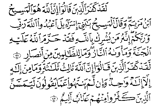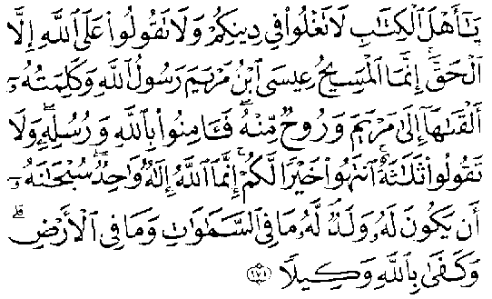 O détenteurs du Livre! Ne dépassez pas la mesure dans votre religion; ne dites, sur Allah, que la vérité. Oui, le Messie, Issa, fils de Marie, est le Prophète de Dieu, son Verbe qu'il a placé en Marie, un Esprit émanant de lui. Croyez donc en Allah et en ses prophètes. Ne dites pas: "Trois"; cessez de le faire; ce sera mieux pour vous. Allah est unique! Gloire à lui! Comment aurait-il un fils? Ce qui est dans les cieux et sur la terre lui appartient. Allah suffit comme protecteur! (Sourate Al-Nissa' - Les Femmes 4,171). L'ange Gabriel adresse de même à Marie les paroles suivantes: