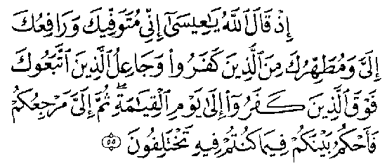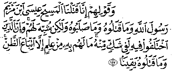 Et parce qu'ils ont dit: "Oui, nous avons tué le Messie, Issa, fils de Marie, le Prophète d'Allah. Alors qu'ils ne l'ont pas tué ni crucifié, mais que son sosie a été substitué à leurs yeux. Ceux qui sont en désaccord à son sujet restent dans le doute; ils n'en ont pas une connaissance certaine; ils ne suivent qu'une conjecture; ils ne l'ont certainement pas tué, mais Allah l'a élevé vers lui: Allah est puissant et juste (Sourate Al-Nissa' - Les Femmes 4,157-158). Dans d'autres passages, le Coran se réfère à la mort de Issa (Jésus), mais les interprètes musulmans proposent des opinions contradictoires sur quelques-uns de ces versets significatifs, traduits par Masson: