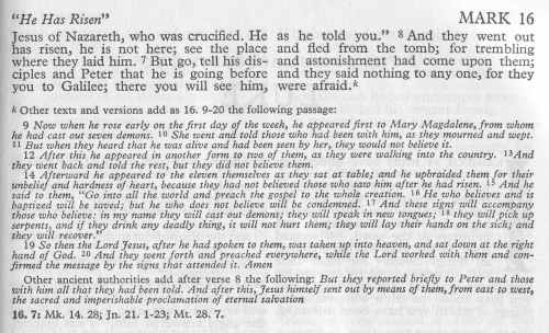 Now please look at the image below, which is a photo copy where the quotation 4a above ought to appear. You will be shocked to note that Mark 16 ends at verse 8, and ... the missing verses appear in "small print" as a footnote at the bottom of the page.