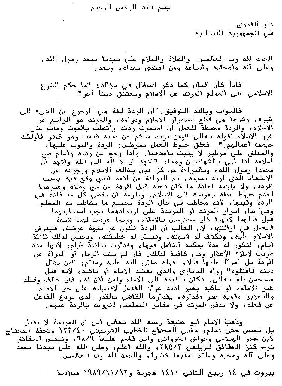 Like the Islamic pronouncement upon Salman Rushdie, the law of apostasy is not simply "an obscene edict from a fanatic sect in Islam".[4] It has a profound connection with Islamic source materials, with all traditional Sunni and Shi'i Islamic legal schools, with Islamic history since its inception. Its legality is a contentious issue in some nations today. Many able and sophisicated Muslim leaders and thinkers justify it and call for its revival and implementation. In short the law of apostasy in Islam is not just a relic of the past but quite alive and well.