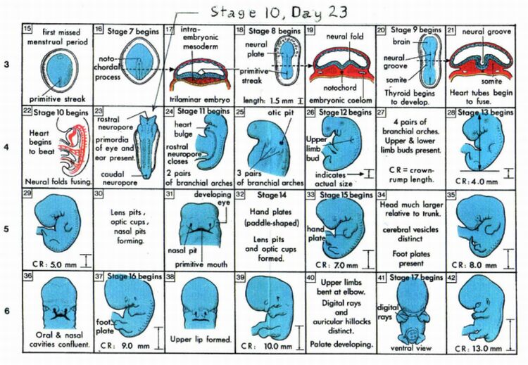 “Na oitava semana após a fertilização, as costelas estariam cartilaginosas e os músculos estariam presentes. Também, ainda neste momento, a ossificação poderia começar próximo do canto das costelas e pode se ampliar ao longo do tronco até que atinja a cartilagem das costelas lá pelo quarto mês. Músculos podem ser capazes de algum movimento na oitava semana, mas por volta da décima a décima - segunda semana esta capacidade poderia estar bem melhor desenvolvida.”