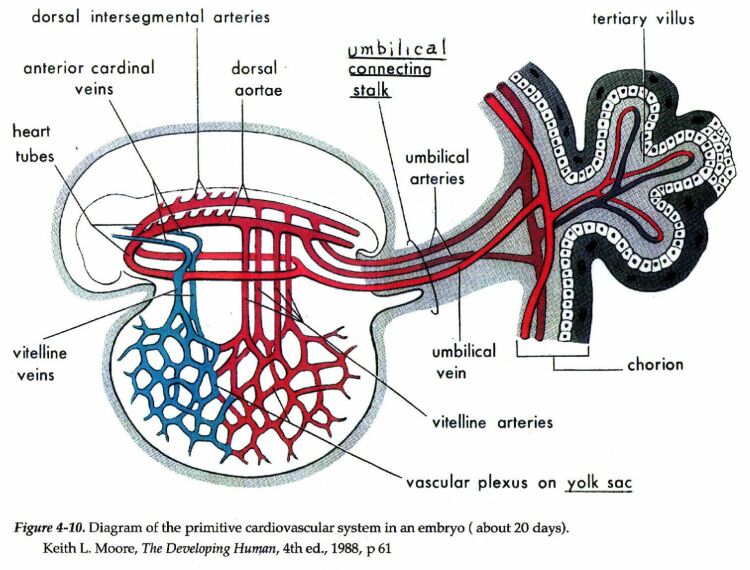 A Figura 4-10[22] exibe o embrião com um amplo saco embrionário e um cordão umbilical conectando. Um sangramento (ou ‘algo que se agarra’) não tem qualquer uma dessas características.