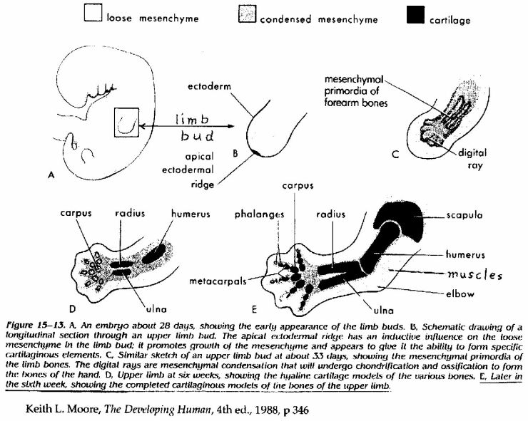 A respeito da fase dos ossos, está claro, tal como Dr. Moore demonstra de modo tão capaz em seu livro-texto, que os músculos começam a se formar ao mesmo tempo em que a cartilagem modela os ossos. Não há fase dos ossos nos quais os membros do feto em desenvolvimento são apenas ossos em volta dos quais músculos serão futuramente bem postos.