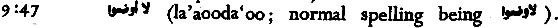 Though the Saudis declare ibn Khaldun’s two examples (Q27:21; and 9:47 which was noted in a quotation in Chapter 3) as "written in the original way" - the extra graphic alif in Q9:47 is not in the Qur’ans they normally publish! But the unwary must be careful not to misinterpret their words concerning spelling ‘in the original way’ as implying ‘spelling which changed over time’. NO! In fact, they are admitting these are ‘original mistakes’ which have been corrected.