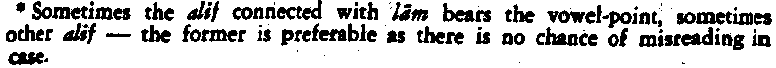 and that the alleged discrepancies between their writing and the principles of orthography are not discrepancies, as has been alleged, but have a reason. For instance, they explain the addition of the alif in  la ‘adhbahannahU "I shall indeed slaughter him" as indication that the slaughtering did not take place ( lA ‘adhbahannahU ). The addition of the ya in bi-ayydin "with hands (power)," they explain as an indication that the divine power is perfect. There are similar things based on nothing but purely arbitrary assumptions. The only reason that caused them to (assume such things) is their belief that (their explanations) would free the men around Muhammad from the suspicion of deficiency, in the sense that they were not able to write well. They think that good writing is perfection. Thus, they do not admit the fact that the men around Muhammad were deficient in writing." (Muqqadimah, ibn Khaldun, vol. 2, p.383f).