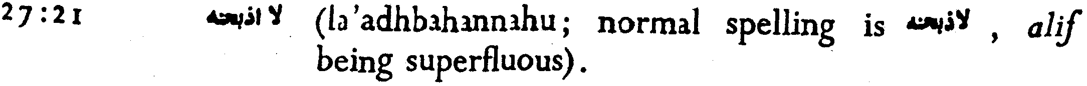 First, we note that in the first paragraph he declares his willingness to admit to "some peculiarities in the writing", but he is unwilling to admit they are ‘mistakes of Muhammad’s scribes’ as others have. He, as Von Denffer and others, advocates that "the transcription of the Holy Qur’an as it was written by the scribes in the Prophet’s time has in fact been preserved intact". However, his list of problem texts is largely the same as that among the other scholars and Q27:21 is the example which ibn Khaldun declared was ‘Proof’ that Muhammad’s scribes were deficient in writing.