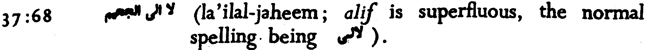 Elsewhere, in the Indian text, we find in Q3:158 that one alif is ‘silenced’ ; in Q9:47 one alif is ‘silenced’ ; in Q27:21; and in Q37:68again with one alif ‘silenced’.