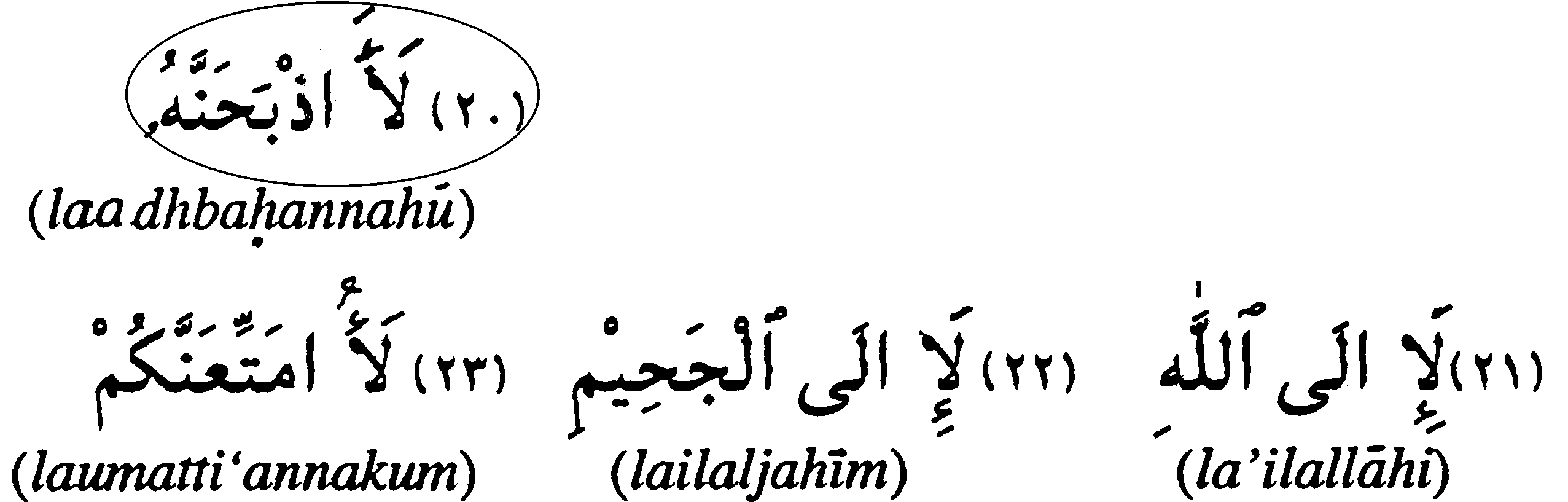 "Lastly I must bring into relief the case of the word la ( ), which in four or five cases is only l ( ) without the final alif. The word la means no, and the word l means certainly.It is horrible to think when it is meant "the believers certainly shall assemble unto God" and "the unbelievers certainly shall assemble in the hell", and the unfortunate ignorant reader unintentionally says "not" instead of "certainly". We will point out these passages in our second list" (Orthographical Peculiarities In The Text Of The Qur’an, M. Hamidullah, Islamic Order (Karachi), Vol. 3, no. 4, 1981, p.78; article received from Islamic Foundation UK; article noted in Ulum, Von Denffer, p.60; emphasis added). [See pages opposite]