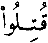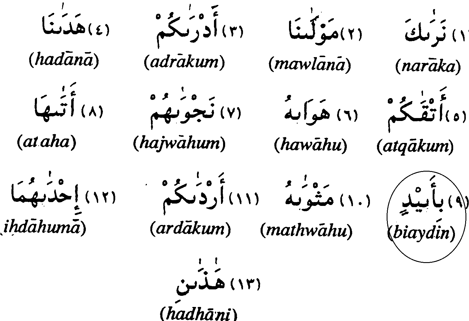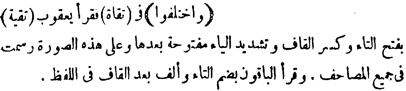 A different meaning results as the following show. - Ya’qub’s reading, using the ya as a y and doubling it, produces the meaning "righteous one". - The ‘9’ replaced the ya with an alif, giving the meaning "righteousness". Such a reading is indicated also by the retaining of the two dots on the ta’ marbuta ( - A true ya alif would give the meaning "righteous ones". In this case the two dots would also be missing from the ta’ marbuta.