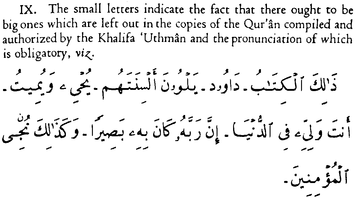 Part 2: The True State Of The Qur'an Back To Main Index h/ Other Consonants Missing Or Added - Yas, Waws & Nuns As we proceed with these topics we begin to see more clearly the purpose of the content of the Note IX of the 1938 Hyderabad text31 which we reproduce again here [see to right]. We begin by noting what Hamidullah has written concerning Egypt’s contribution to what he calls "the profuse markings of pronunciation (i‘rab) in the usual copies of the Qur’an". Under the heading "Egypt’s share in the development of Arabic script" he notes: "In recent years, especially in Egypt, some new signs have been added to the list, in order to facilitate the marking of the assimilation of sounds and other subtleties of the Arabic phonetics." (Orthographical..., p. 76) The Notes, then, were necessary since in 1938 Pickthall’s text was printed alongside an Arabic text almost identical to32 the 1924 Royal Cairo Edition which contained Egypt’s "new features". The Notes were thus intended to orient people to certain new features, many of which had never been seen in a text in India before33. We have already noted the dagger alif which Hamidullah listed and which is also included in this Note. It should not surprise us, then, to find that the other examples in this Note are also admitted by M. Hamidullah and included in his list of yas, waws and nuns omitted from the ‘Uthmanic texts. 1/ yas omitted Yet there are also words without yas of which Hamidullah says: "It is not written in the [case of] which occur altogether 69 times and could be written The case of the word ( Again, it should not be called ‘curious’ that any word, let alone the name Ibrahim (Abraham), is spelled in two different ways, but NOT EVER in the right way which requires another alif ( 151 |