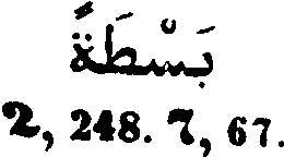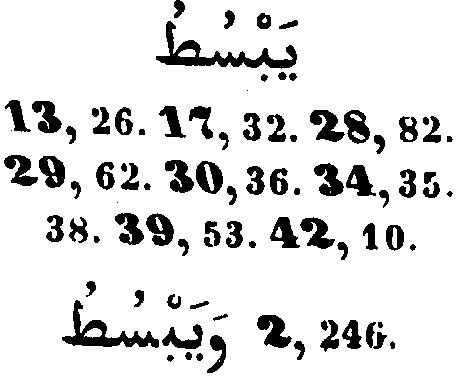 lists only the corrected spelling of yabsutu Q13:26 17:30 28:82 29:62 30:37 34:36 34:39 39:52 42:12 to say nothing of the many other times that variations of the same word occur. A ‘letter for letter’ (complete) examination of several Arabic texts also indicates this. Flugel also lists only 2 occurrences of the word bastatan, A 1797 text from Istanbul has corrected both Q2:245 The Samarqand ‘original’ [Page #367, line #7 which can be seen at right]