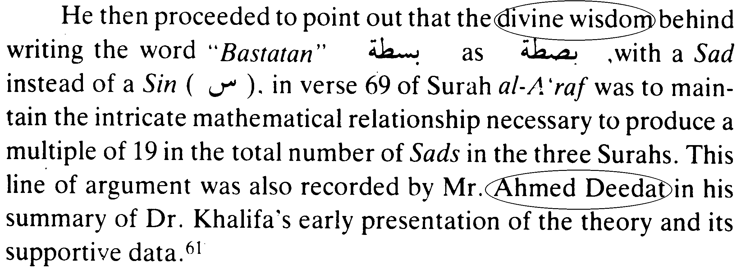 Part 2: The True State Of The Qur'an Back To Part 2 Index [The page of the Samarqand MSS with the text of Q2:245 is one of those missing.] Finally, the Warsh text has no small sin above the sad in either Q2:245 or Q7:69. Strangely the Islamic mind can attribute the mistakes in the graphic form to ‘Divine Wisdom’. As Bilal Philips (#19, p. 23) recounts when noting this very same text from Dr. Khalifah’s writings (circles are added):