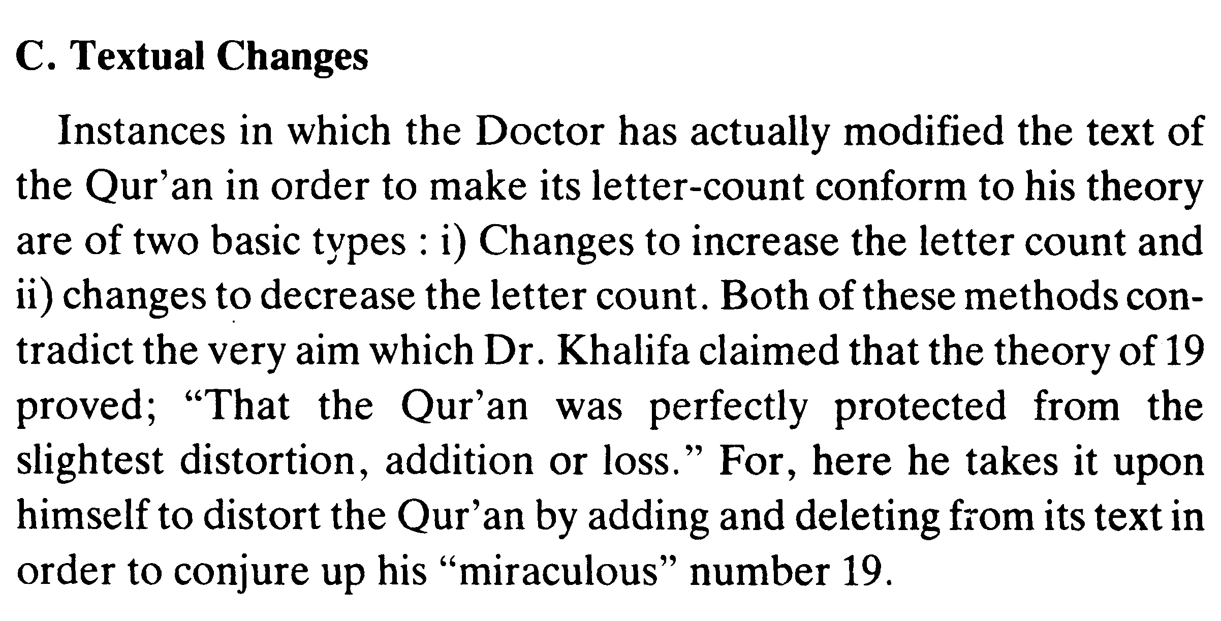 Part 2: The True State Of The Qur'an headings; a) Counting non-existent letters b) Not counting existing letters c) Changing the Text of the Qur’an". And, he continues to give data under: "A. Non-existent Letters. B. Existing Letters Ignored i) Additions to The Qur’an’s Text ii) Deletions from The Qur’an’s Text" (‘19’, p. 23) Surely it couldn’t have been better stated if it had been written for the purpose of defining Islam’s tamperings?! The content of only one of these sections will indicate how well they express what we have seen of Islam’s actions concerning the text of the Qur’an (to say nothing of its other books):