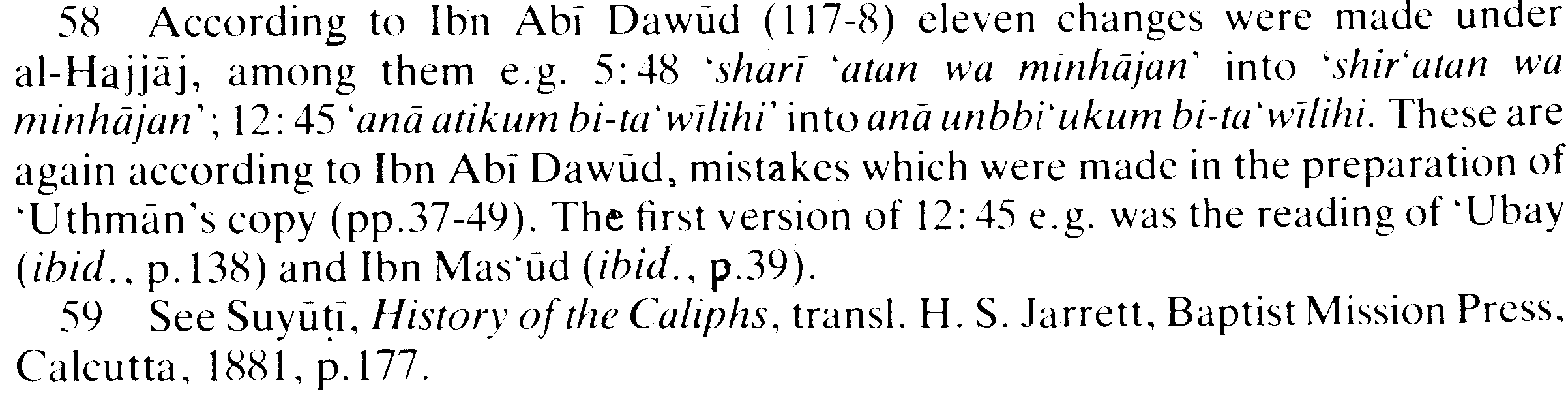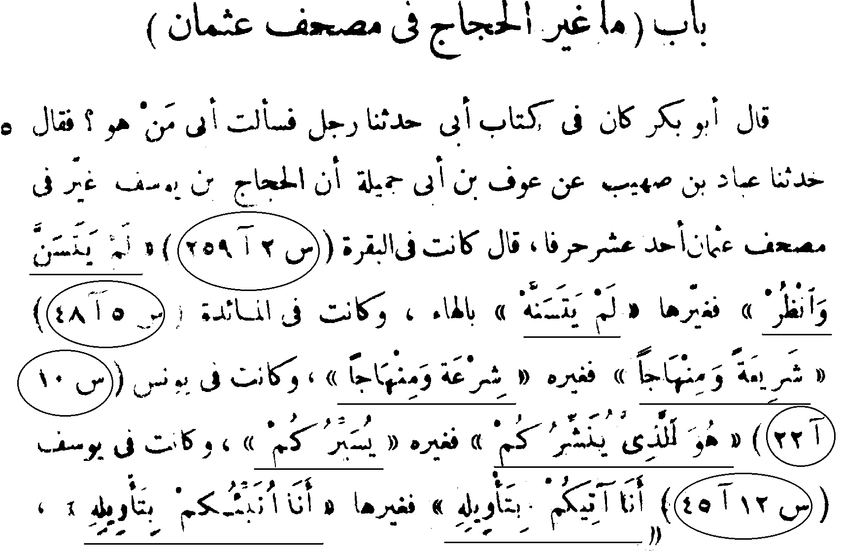 The full text of this can be seen in the scans of pages 117 and 118 of ibn Abi Da’ud’s Kitab al-Masahif at right. [Portions of pages 117 and 118 (upper and lower respectively as demarcated by ***) indicating the eleven alterations to the Qur’an by the strongman Al-Hajjaj. For convenience the ‘old’ and ‘new’ texts have been underlined and the Aya and Surah numberings encircled.]