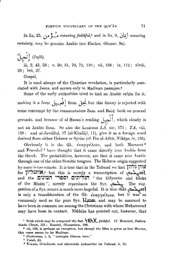 The Injil ... (or Injeel) is one of the five Islamic Holy Books the Qur'an records as revealed by God, the others being the Suhuf-i-Ibrahim, Zabur, Tawrat and Qur'an. The word Injil is generally held by non-Muslim historians to be an abbreviation of the Greek word Ευαγγελιον, sometimes rendered in English as "evangel" (literal meaning "good news"). It is usually translated as "Gospel", as in the four Gospels of the New Testament. (Wikipedia, Injil, 20 July 2008; underline emphasis ours; cf. the entry Injil in Arthur Jeffery's The Foreign Vocabulary of the Qur'an, pages 71-72)