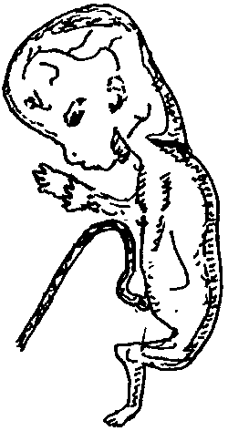 Moving onto the next stage of development, Razi described the mudghah as being a little piece of meat the size of what a man can chew. The idea that mudghah means chewed flesh is a later, and less accurate translation of the word, but the idea has persisted because it is claimed that the somites from which the backbone and other trunk structures develop bear a passing resemblance to teeth marks implanted in plastercine. It must be said that not only is this an imaginative interpretation however, but besides, Moore cannot claim that the mudghah should occur at 26-27 days since at that point the embryo is a mere 4mm long. One would have to wait around 8 weeks before the embryo was the size of chewed flesh (if a mouthful is defined as being 20-30mm wide), which is what mudghah really means. And in the following Hadith, transmitted by Bukhari and Muslim, Muhammed claims that the mudghah stage occurs between days 80 and 120. Yet by this time the foetus is considerably larger than a lump of flesh the size of which a man can chew, and looks very human-like and totally unlike meat.