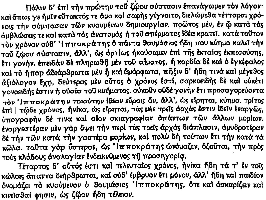 But let us take the account back again to the first conformation of the animal, and in order to make our account orderly and clear, let us divide the creation of the foetus overall into four periods of time. The first is that in which. as is seen both in abortions and in dissection, the form of the semen prevails (Arabic nutfah). At this time, Hippocrates too, the all-marvelous, does not yet call the conformation of the animal a foetus; as we heard just now in the case of semen voided in the sixth day, he still calls it semen. But when it has been filled with blood (Arabic alaqa), and heart, brain and liver are still unarticulated and unshaped yet have by now a certain solidarity and considerable size, this is the second period; the substance of the foetus has the form of flesh and no longer the form of semen. Accordingly you would find that Hippocrates too no longer calls such a form semen but, as was said, foetus. The third period follows on this, when, as was said, it is possible to see the three ruling parts clearly and a kind of outline, a silhouette, as it were, of all the other parts (Arabic mudghah). You will see the conformation of the three ruling parts more clearly, that of the parts of the stomach more dimly, and much more still, that of the limbs. Later on they form "twigs", as Hippocrates expressed it, indicating by the term their similarity to branches. The fourth and final period is at the stage when all the parts in the limbs have been differentiated; and at this part Hippocrates the marvelous no longer calls the foetus an embryo only, but already a child, too when he says that it jerks and moves as an animal now fully formed (Arabic a new creation) ...