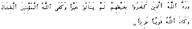 And God drove back the misbelievers in their rage; they gave no advantage; God was enough for the believers in the fight, for God is strong, mighty.