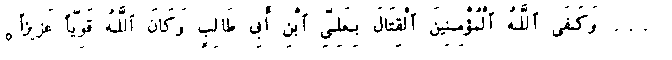 God was enough for the believers in the fight in support of 'Ali ibn abi Talib, for God is strong, mighty.