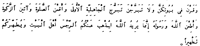 And stay still in your houses and show not yourselves with the ostentation of the ignorance of yore; and be steadfast in prayer, and give alms, and obey God and His Apostle; - God only wishes to take away from you the horror as people of the House and to purify you thoroughly.