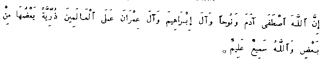 Verily, God has chosen Adam and Noah and Abraham's people, and 'Imran's people, above the worlds, --- a seed, of which one succeeds the other, but God both hears and knows.