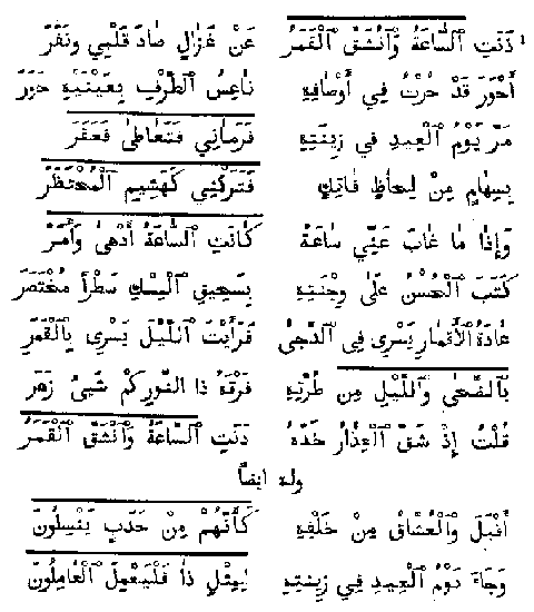2. The Rev. Dr. Zwemer, of Bahrain, however, informs me that he has found the words Danati 'ssa`atu wa'nshaqqa 'lqamaru (cf. Surah LIV., 1, Iqtarabati 'ssa`atu wa'nshaqqa 'lqamaru) in the last section of the last poem of Imrau'l Qais in an edition which he possesses. He adds: "A Shaikh taught in Al Azhar tells me that this evident quotation perplexes learned Muslims."