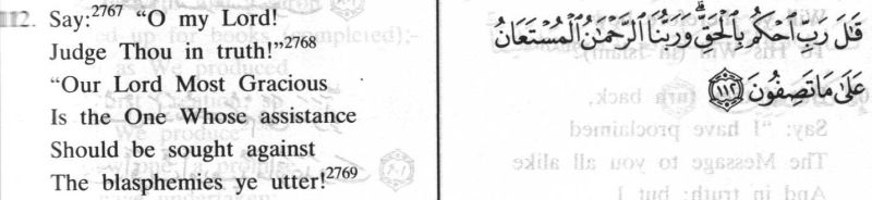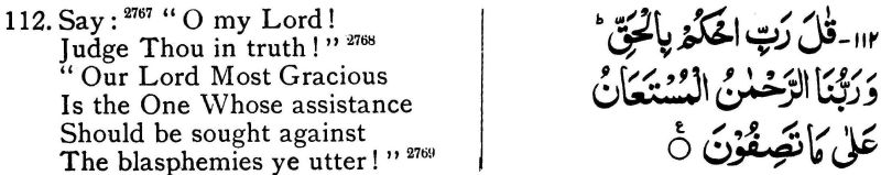| 2767. See above, n. 2666 to xxi. 4. The better reading is "Say" in the imperative, rather than "He (the Prophet) said (or says)" in the indicative mood. Note that, on that construction, there are three distinct things which the Prophet is asked to say: viz.: (1) the statement in verses 109-111, addressed to those who turn away from the Message; (2) the prayer addressed to God in the first part of verse 112; and (3) the advice given indirectly to the Believers, in the second part of verse 112. I have marked these divisions by means of inverted commas. | 2767. See above, n. 2666 to xxi. 4. The better reading is "Say" in the imperative, rather than "He (the Prophet) said (or says)" in the indicative mood. Note that, on that construction, there are three distinct things which the Prophet is asked to say: viz.: (1) the statement in verses 109-11, addressed to those who turn away from the Message; (2) the prayer addressed to Allah in the first part of verse 112; and (3) the advice given indirectly to the Believers, in the second part of verse 112. I have marked these divisions by means of inverted commas. |
