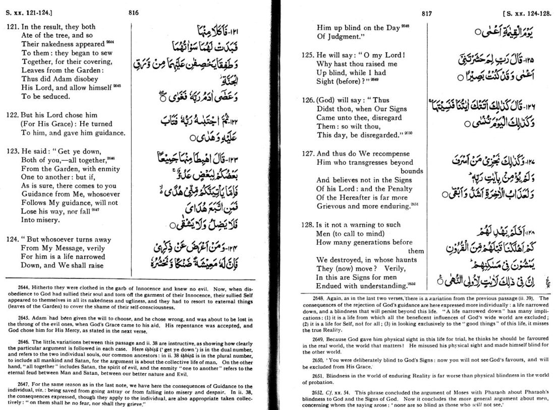 The following is an image of S. 20:121-128 in Yusuf Ali's version of the Qur'an, printed in