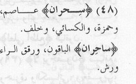 "sihran (two magics) [is the reading of Abu Bakr] ‘Asim, and Hamzah, and al-Kisa’i, and Khalaf [al-Bazzar]."