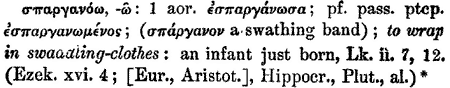 And as for thy birth in the day wherein thou wast born, thou didst not bind thy breasts, and thou wast not washed in water, neither wast thou salted with salt, neither wast thou swathed in swaddling-bands (kai sparganois ouk esparganothes). Ezekiel 16:4