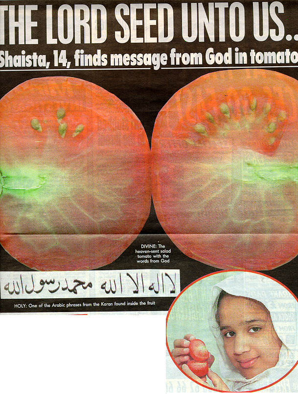 In other words, if my religion has a problem, then so does yours. As a Bible believing Christian, I do not accept such things as a sign of anything - God is not the deceiver, that distinction belongs to Satan. Bleeding statues, crying icons, milk drinking Ganesh statues, the Shahada in the tomato, and false prophets such as Muhammad, Joseph Smith, and Sun Yung Moon are deceptions created by man and/or Satan.