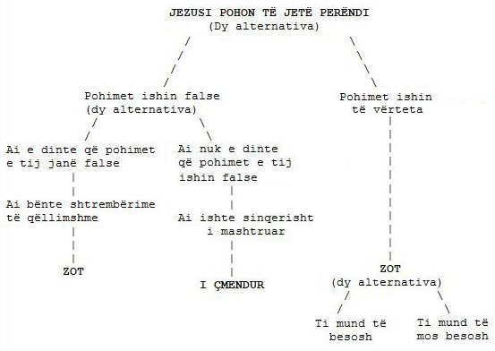 Po përpiqem të parandaloj ndonjë që do të thotë marrëzira që njerëzit shpesh thonë për Të: “Jam gati ta pranoj Jezusin si një mesues të madh moral, por nuk pranoj pohimin e Tij se ishte Perëndi”. Kjo është një nga gjërat që nuk duhet ta themi. Një njeri që ishte thjesht njeri dhe ato gjëra që Jezusi tha nuk mund të jetë vetëm një mësues i madh moral. Ai ose do të ishte lunatik në të njëjtin nivel me atë që thotë se ai është një vezë e zier pa lëvozhgë – ose do të ishte djalli i ferrit. Ju duhet të bëni zgjedhjen tuaj. Ose ky njeri ishte dhe është Biri i Perëndisë: ose ndryshe një i çmendur apo diçka më keq se kaq. Ju mund ta mbyllni atë si një të çmendur, ju mund ta pështyni Atë ose ta vrisni Atë si një demon; ose mund të bini para këmbëve të Tij dhe ta quani Perëndi dhe Zot. Por le të mos e marrim në mbrojtje pa kuptim duke thënë se ishte një mësues i madh. Nuk e ka lënë këtë të hapur për ne. Nuk kishte këtë qëllim. [4]