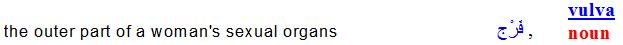 Här följer ytterligare ett engelskt-arabiskt uppslagsverk (*) som visar att ordet ”farj” betyder ”vagina” och (*; *). Se också följande (*; *) men se till att du klistrar in det arabiska ordet الفرج i vänster ruta sen klickar du på ”translate”, vilket kommer visa att ordet betyder ”vagina”.