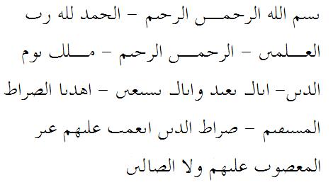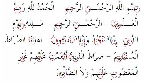 Det finns mer. Uthmans Koran genomgick ännu en uppdatering. Dagens arabiska skrivs med (1) bokstäver, (2) prickar (i'jam) och (3) tecken (tashkil). Det är de två senare – i'jam och tashkil – som vokaliserar en arabisk text. Uthmans Koran hade varken prickar eller tecken, utan dessa lades till under 700-talet. Dessa prickar och tecken kan mycket sannolikt ändra innebörden av en arabisk text. Vi ska illustrera detta genom att citera Koranens första kapitel (al-Fatiha) utan vokalisering. Låt oss första läsa Koranens första kapitel: