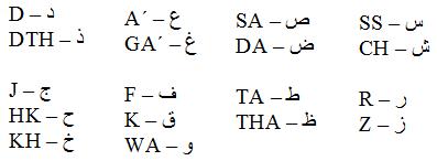 De fyra bokstäverna nämns 31 gånger i texten. Notera att det som skiljer bokstäverna åt är antalet prickar över och under bokstaven. Om vi ändrar prickarna ändras bokstaven och om vi ändrar bokstaven ändras ordet. Det arabiska alfabetet innehåller många bokstäver som ser likadana ut men som ändras vid förändring av prickar. Här följer de bokstäverna: