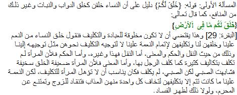 [kon: 29] och detta kräver att hon inte är skapad för att tillbe och för att ingå förpliktelser så vi säger att skapandet av kvinnan är en av benådningarna över oss (män) och han (Allah) skapade de för oss och förpliktade de för att fullborda benådningen över oss. Inte att de är förpliktade liksom vi är förpliktade och detta ifråga om förmedling och ledarskap och väsentligheter, vad gäller förmedlig är det just detta och annat, och vad gäller ledarskap just för att kvinnan inte är ålagd så många plikter som mannen, och vad gäller väsentligheter just för att en kvinna är en svag skapelse och lättlurad liknas hon med ett barn och ett barn, förpliktas inte därför passar det inte att en kvinna förpliktas, men benådningen över oss är inte fulländad förrän de förpliktas så att var och en av dem fruktar lidandet och följer hennes man och håller sig borta från vad som är förbjudet, i annat fall skulle korruption uppkomma." [vår översättning] Länk