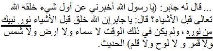 "… Jabir sa till honom [Muhammed]: (O Allahs sändebud kan du berätta för mig om den första saken som Allah skapade innan [han skapade] sakerna? Han sa: O Jabir Allah skapade innan sakerna din profets ljus från hans ljus, och på den tiden fanns inte himlen och inte jorden och inte solen och inte månen och inte tavla och inte penna) rapporten." [vår översättning] (Nur-Al-Din al-Halabi, Al-Sirah al-Halabiya, vol.1, sid.214, ISBN: 2-7451-3370-5)