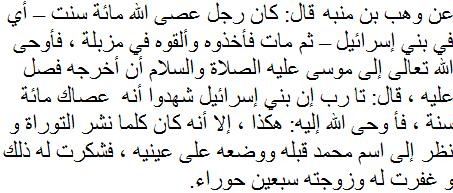 "Från Wahb bin Monabbah som sa: En man motsatte sig Allah i hundra år – från Israels folk – när han dog tog dem honom och lade honom i en soptipp, så Allah inspirerade Moses [att ta bort honom från soptippen] så han tog bort honom och bad över honom, och sa: Oh herre Israels folk vittnade hur han motsatte dig i hundra år, så Allah inspirerade [Moses]: Det stämmer, men varje gång han läste Toran och såg namnet Muhammed framför sig lade han [Muhammeds namn] på hans ögon, så jag [Allah] tackar honom för det och förlåter honom och gifter honom med 70 kvinnor [i paradiset]." [vår översättning] (Nur al-Din al-Halabi, Al-Sirah Al-Halabiyah, vol.1, sid.122-123, ISBN: 2-7451-3370-5)
