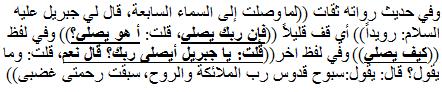 "Och enligt en trovärdig tradition ((när jag [Mohammad] kom fram till den sjunde himlen, sa Gabriel till mig frid vare över honom: Lugn)) alltså stanna upp lite ((för att din herre ber, jag sa: Ber han verkligen?)) och i en annan version ((hur ber han)) och enligt ännu en version ((jag [Mohammad] sa: O Gabriel ber verkligen din herre? Han sa ja, jag sa: vad säger han? Hans sa: han säger ärad helig är änglarnas och andens herre, min nåd förbigår min vrede))" [vår översättning] (Nur al-Din al-Halabi, Al-Sirah al-Halabiyah, vol.1, sid.567, ISBN: 2-7451-3370-5 [vår översättning])