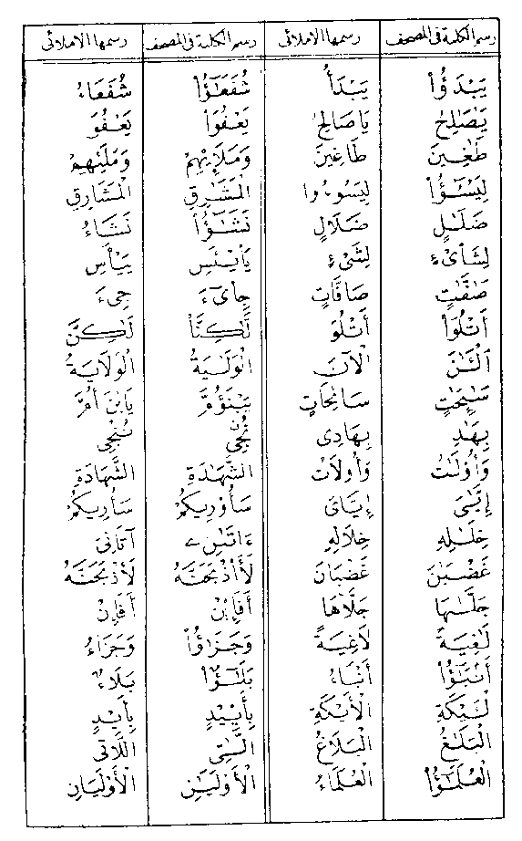 கீழ் கண்டவற்றில் 1) என்று உள்ள பத்தியில் Column) இருக்கும் வார்த்தைகள் இப்போது உள்ள குர்ஆனில் உள்ளவைகள் ஆகும். அதே போல 2) என்று உள்ள பத்தியில் இருக்கும் வார்த்தைகள் உண்மையில் அவ்வார்த்தைகள் எப்படி இருக்க வேண்டும் என்றும் மற்றும் அரபியில் அதனை எப்படி சரிபடுத்தினார்கள் எனபதையும் குறிக்கும்.