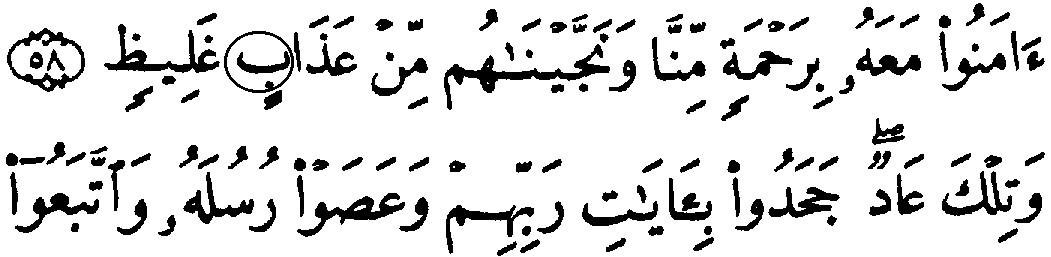 - பன்னிரண்டாம் வரியில் 'மூல' குர்ஆனில் 11:58ம் வசனத்தில் "டால் (dal)" என்ற எழுத்து இருக்கின்றது, ஆனால், தற்கால குர்ஆனில் அந்த எழுத்திற்கு பதிலாக "ப (ba)" உள்ளது.