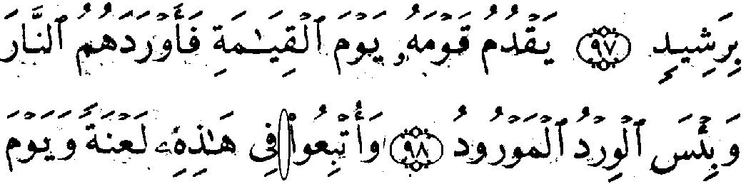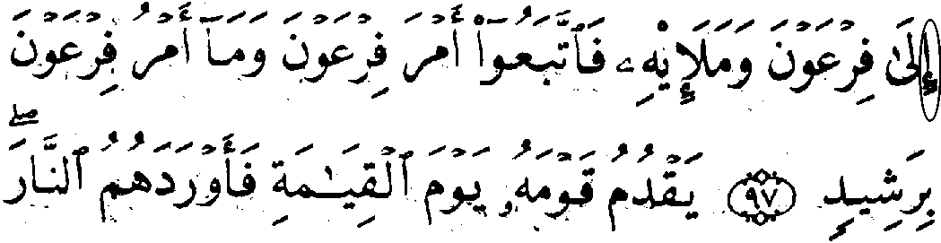 - முன்றாம் வரியில் 'மூல' குர்‍ஆனின் 11:97ம் வசனத்தில் "அலீஃப்" என்ற எழுத்து காணப்படவில்லை, ஆனால், தற்கால குர்‍ஆனில் அது உள்ளது.