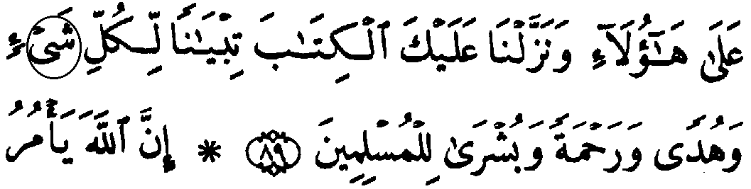 - முதல் வரியில் 'மூல' குர்‍ஆனில் 16:89ம் வசனத்தில் "அலீஃப்" என்ற எழுத்து உள்ளது, ஆனால், தற்கால குர்‍ஆன்களில் இவ்வெழுத்து காணப்படுவதில்லை.