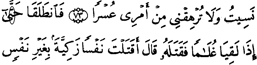 - முதல் வரியில் 'மூல' குர்‍ஆனில் 18:74ம் வசனத்தில் "லாம்" காணப்படுகிறது ஆனால், தற்கால அரபி குர்‍ஆன்களில் "லாம்" எழுத்திற்கு பதிலாக "ட (ta)" என்ற எழுத்து காணப்படுகிறது.