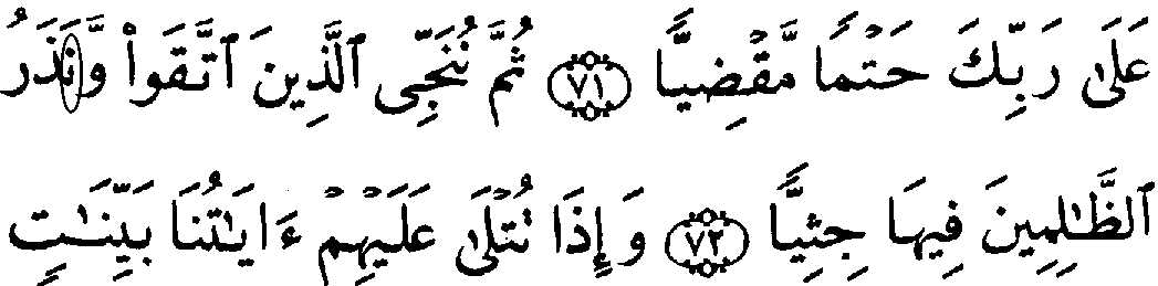 - பன்னிரண்டாம் வரியில் 'மூல' குர்‍ஆனில் 19:72ம் வசனத்தில் "ஃப" அல்லது "காப்" என்ற எழுத்து காணப்படுகிறது, ஆனால், தற்கால குர்‍ஆனில் "நூன்" என்ற எழுத்து காணப்படுகிறது.